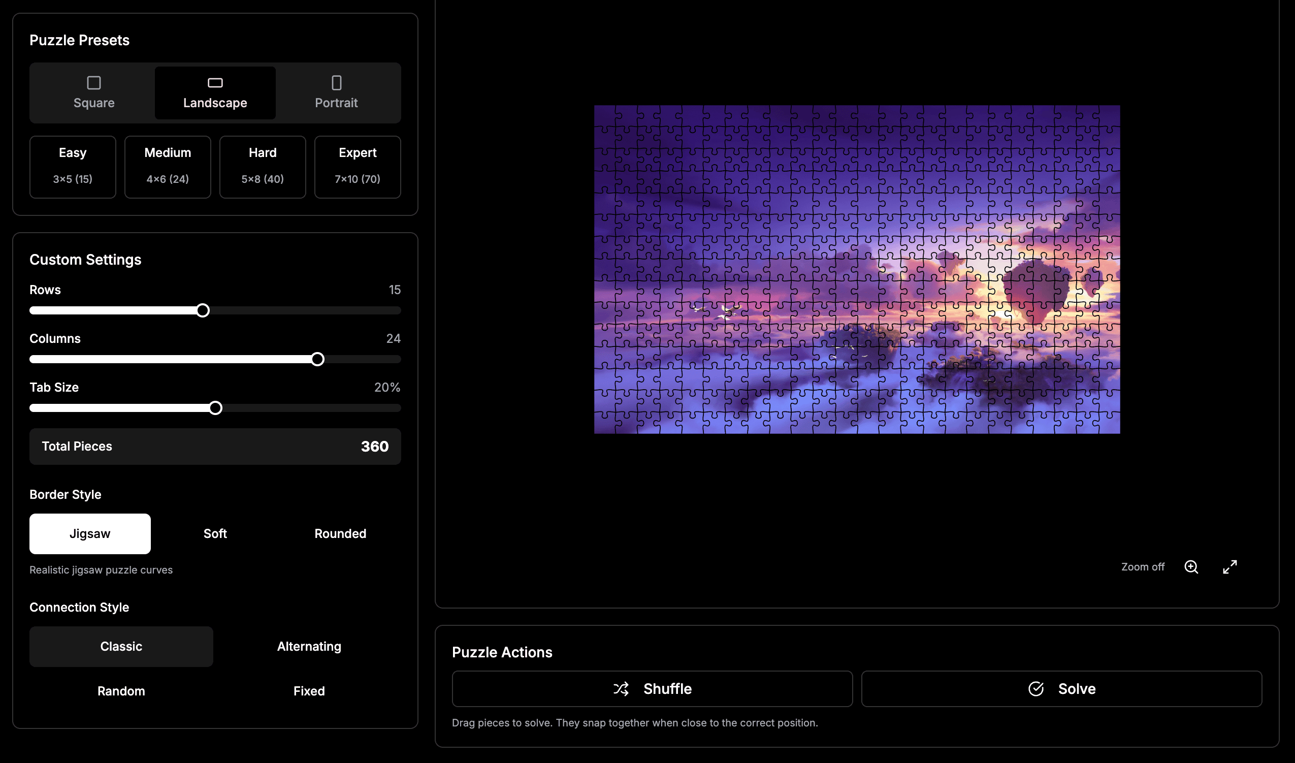Once your puzzle generates, play it immediately. Drag pieces and drop them where they belong. When pieces get close to the right spot, they snap together automatically.